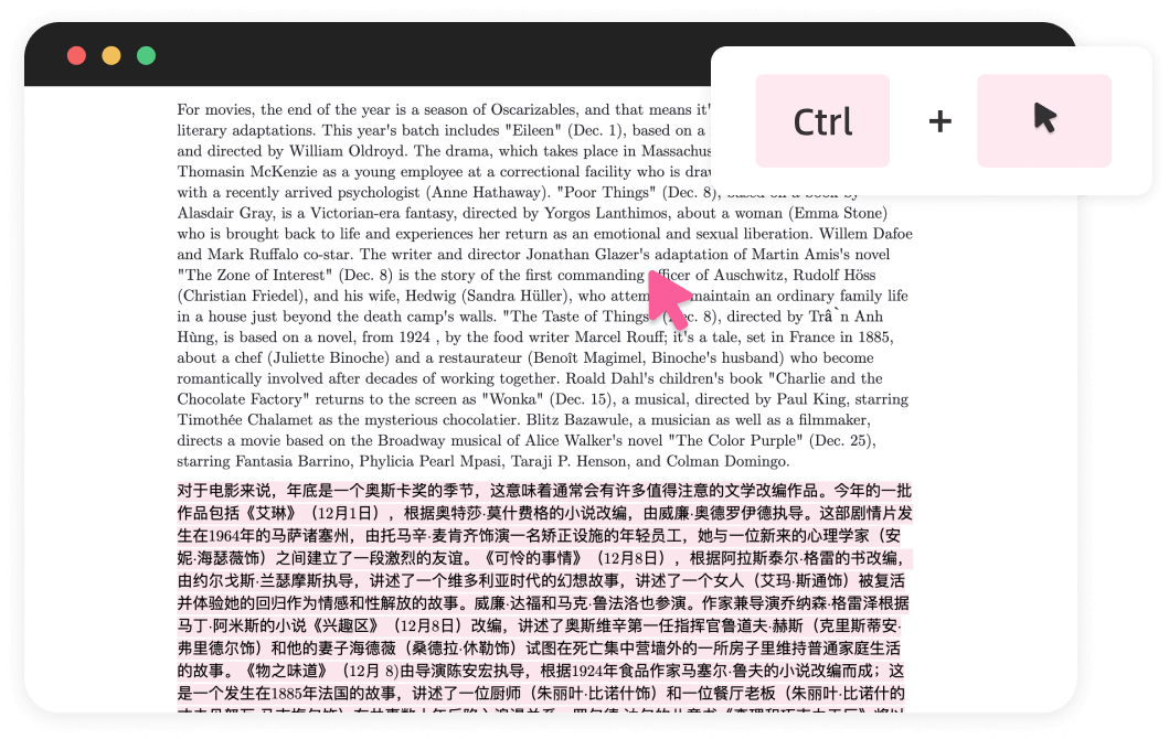 Immersive Translate trae otra innovación revolucionaria en la interacción: la traducción al pasar el mouse. Simplemente coloca el cursor sobre cualquier párrafo y presiona la tecla de acceso rápido preestablecida (como Ctrl), y la traducción del párrafo actual aparecerá inmediatamente después del párrafo.